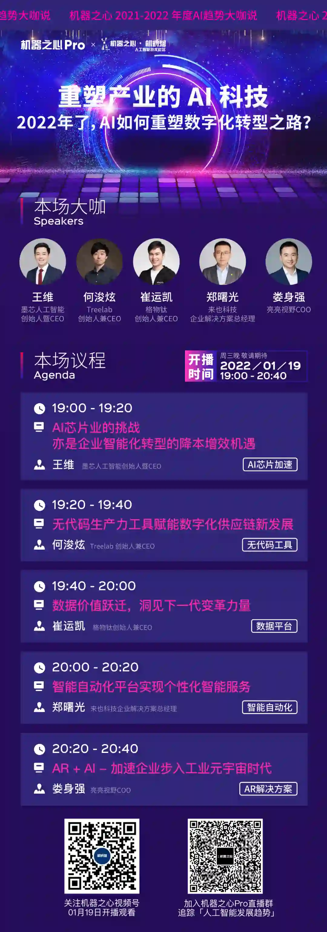 机器之心 2021-2022 年度 AI 趋势大咖说 2022 年 1 月 19 日场次主题为 “重塑产业的 AI 科技 ——2022 年了,AI 如何重塑数字化转型之路?” 来自墨芯科技、TreeLab、格物钛、来也科技、亮亮视野的五位嘉宾将分别通过分享 AI 芯片加速、无代码工具、数据平台、智能自动化、AR 解决方案等方面的影响的出发,全面解读 AI 时代各企业的数字化转型之道。