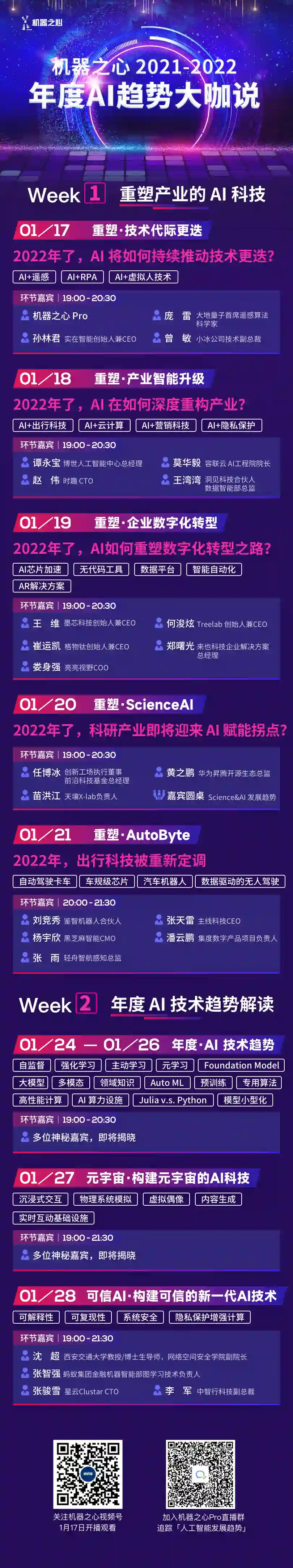 2022 年 1 月,机器之心的年度特别线上策划,「机器之心 2021-2022 年度 AI 趋势大咖说」即将再次重磅来袭!届时,近 40 位 AI 领域知名学者、产业专家及企业高管将云聚机器之心机动组视频号直播间,带来为期 10 天,超过 1000 分钟的超密集干货分享!