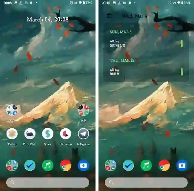 Android 那边就简单了,用 Nova 也好 ,Lawnchair 也好,都能上划图标来打开其他应用,针对这一点,我尽量采用一一对应的原则,譬如上划相机图标打开的就是相册,上划 Chrome 图标打开的就是 Via 这个浏览器。必要的小部件尽量选择美观实用的,譬如 Android 上使用 Home Agenda 来显示日历事项。