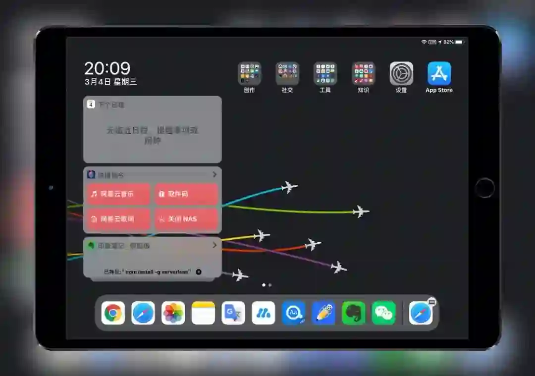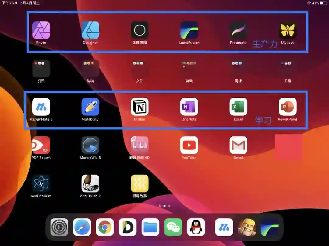 我就把它当个大手机来说吧,其实主要思路还是「视觉隔离」。首屏页给 Apple,第二屏我就开始遵循「最重要的放在最上面」这个原则了,因为平板相较手机来说,垂直距离大了很多,这样区分应用也方便了很多。最上面放最硬核的干活工具,抬眼就能看到,然后放一排文件夹隔离视线,下面放一排次重要的应用,都是点击一次就可以打开。所以我依然是「能走两步到达的不走三步」。这次,社交应用被我移到了 dock。