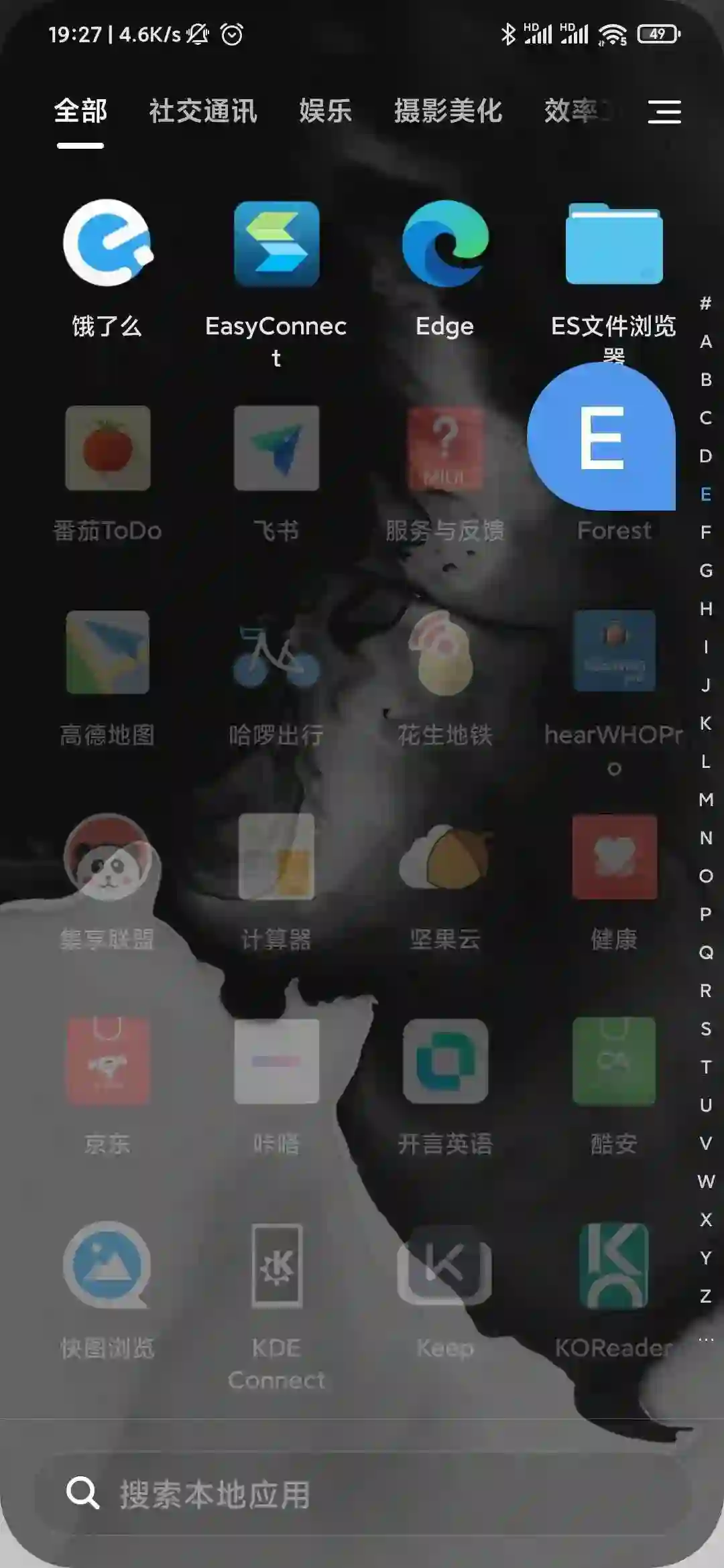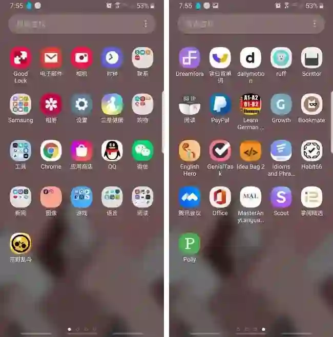 通过在首屏上划,可以直接到达应用界面。顶部的搜索框我几乎未曾使用过。在这个页面可以看到,针对各类应用,我只是做了一个初步分类。得益于目前各手机系统的优化,它可以给分组应用提供一个准确的分类,如:游戏,新闻,阅读,工具等。
