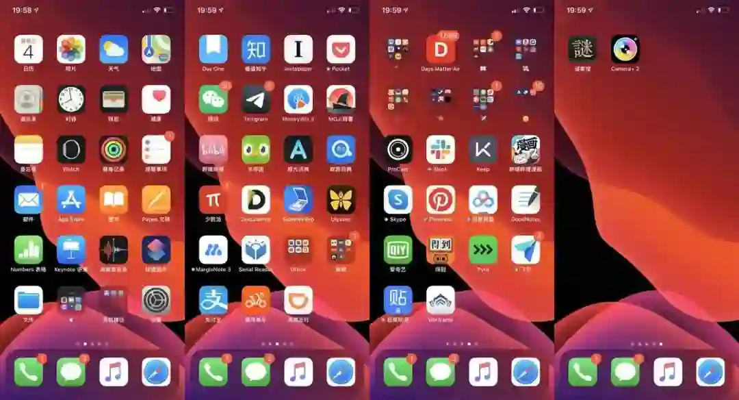 第二屏的每行 4 个图标,我采用了一个常用应用 + 3 个文件夹的形式,也算是形成了一种视觉隔离和视线引导。以前自己爱把常用的社交应用放在一个文件夹里,可能很多人也会这么做,后来想想这其实是一个错误。因为每次打开的时候都要多一步「打开文件夹」的操作,很繁琐。后来我看到好多女孩子都喜欢把微信放在 dock,这也是挺好的,可是我不习惯。对我来说,dock 上放「电话、信息、浏览器、相机」已经是保留了好多年的上古习惯了。不管怎么说,最后干脆就直接把它们放在桌面啦。