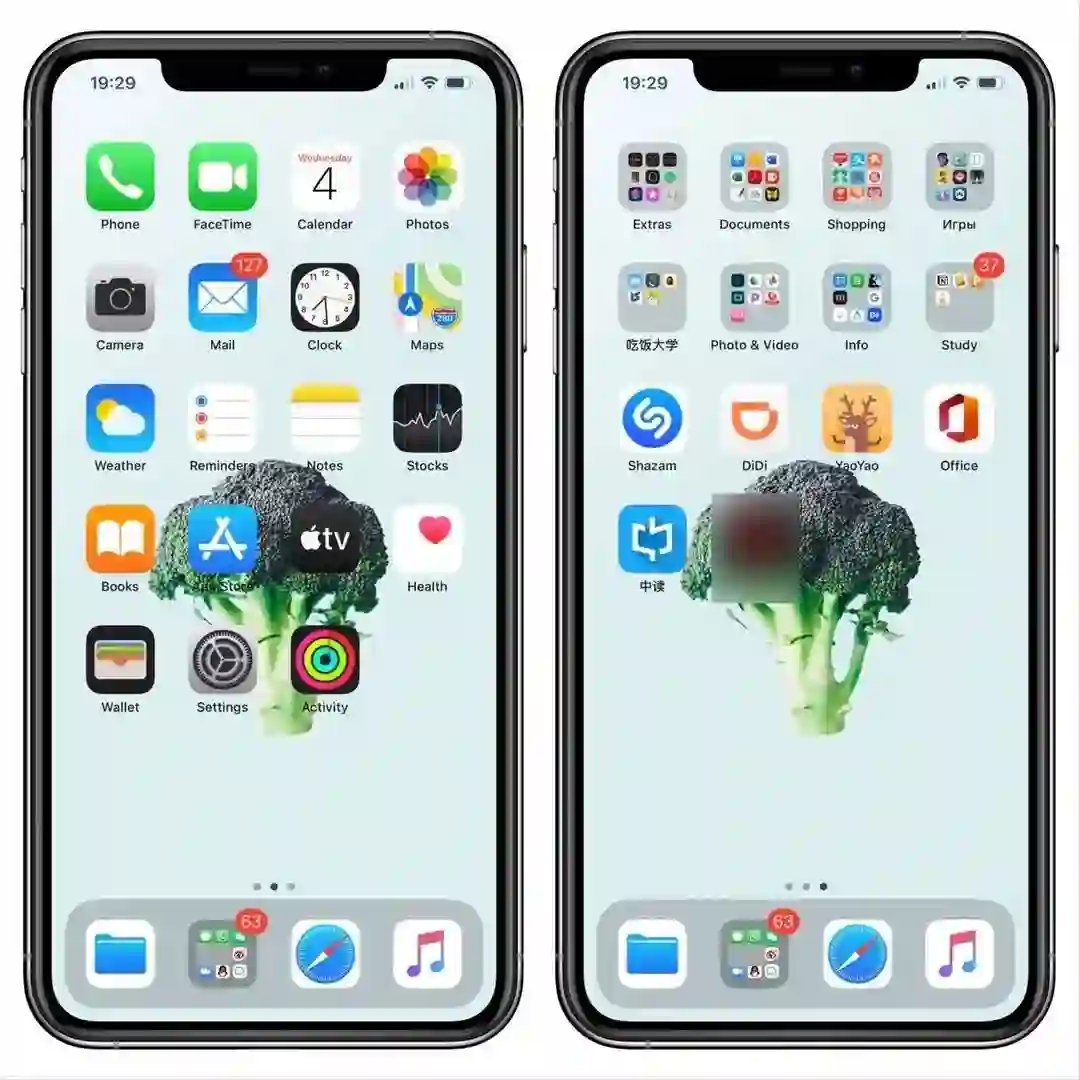说起主屏幕,我喜欢各个设备的壁纸都差不多,所以我的 iPad、iPhone 和 Mac 的壁纸都是同一张西兰花(笑)。在这张照片上,跨设备的尺寸问题用 Photoshop 和内容识别填充就很容易解决。