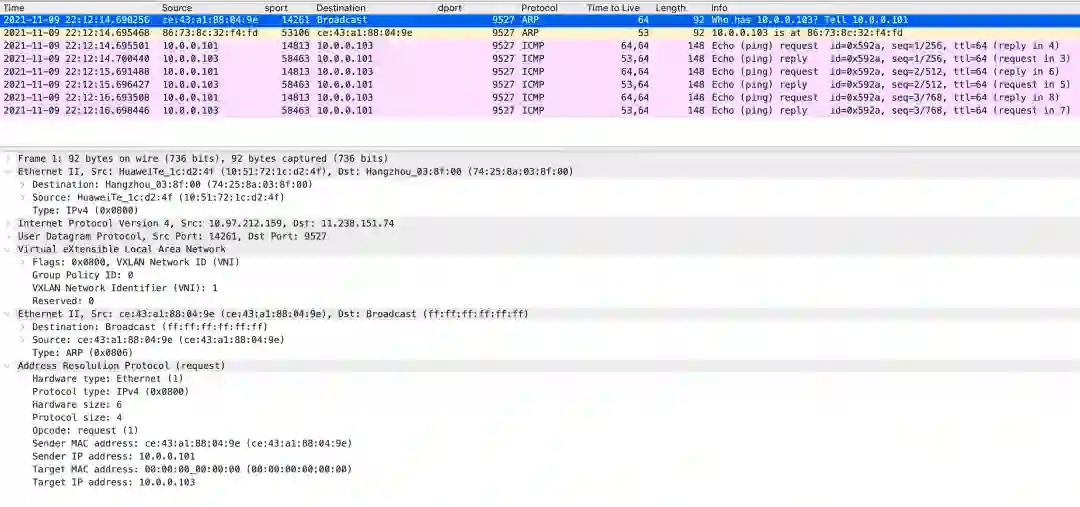 使用 Linux 内核 VXLAN 封装数据包的方式和原理上文已经介绍过了,Flannel 创建了一个名为 flannel.1 的 VETH 设备。因为