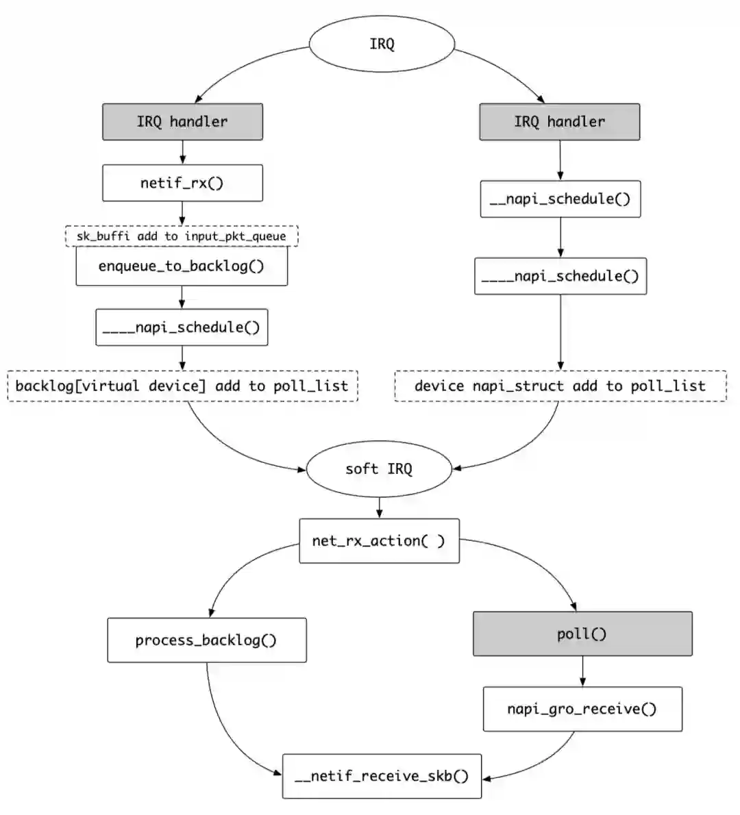 非 NAPI 模式和 NAPI 模式下的流程对比如下(其中灰色底色是设备驱动要实现的,其他都是内核自身的实现):