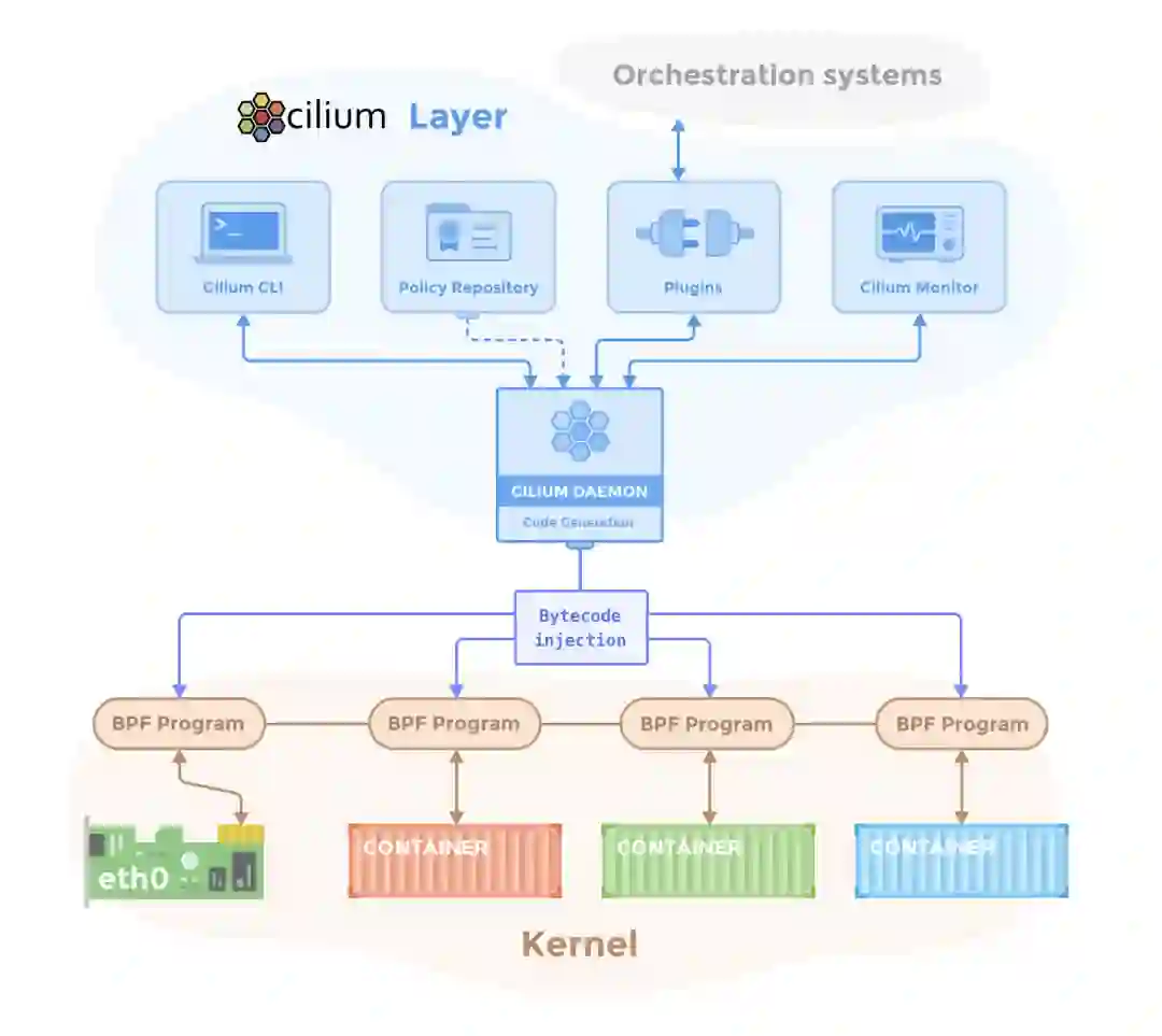 光从这个介绍上就看出来 Cilium 散发出的那种与众不同的气息。这个项目目前的 Github Star 数字快过万了,直接力压前面两位。Cilium 部署后会在宿主机上创建一个名为 cilium-agent 的守护进程,这个进程的作用就是维护和部署 eBPF 脚本来实现所有的流量转发、过滤、诊断的事情(都不依赖 Netfilter 机制,kenel > v4.19 版本)。从原理图的角度画出来的架构图很简单(配图来自 github 主页):