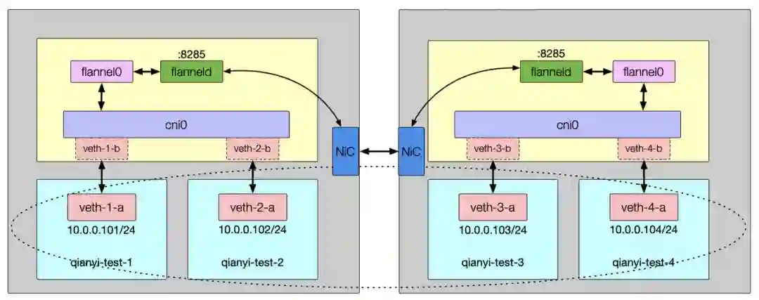 进程均监听着宿主机上的 UDP 8285 端口,相互之间通过 UDP 协议包装 IP 包给目的主机完成通信。之前说过这个模式性能差,差在哪里?这个方案就是一个在应用层模拟实现的 Overlay 网络似得(像不像一个用户态实现的 VETH 设备?),数据包相比内核原生支持的 VXLAN 协议在用户态多了一次进出(