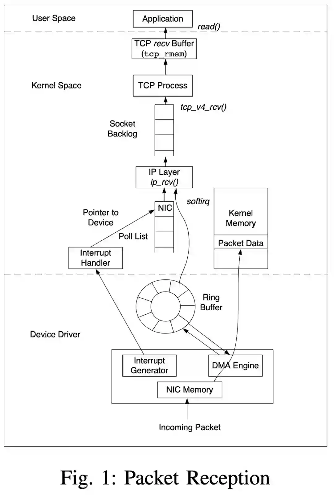 具体到 NIC 的处理流程如下:当 NIC 收到数据时,会以 DMA 方式将数据拷贝到 Ring Buffer (接收队列) 里描述符指向的映射内存区域,拷贝完成后会触发中断通知 CPU 进行处理。这里可以使用