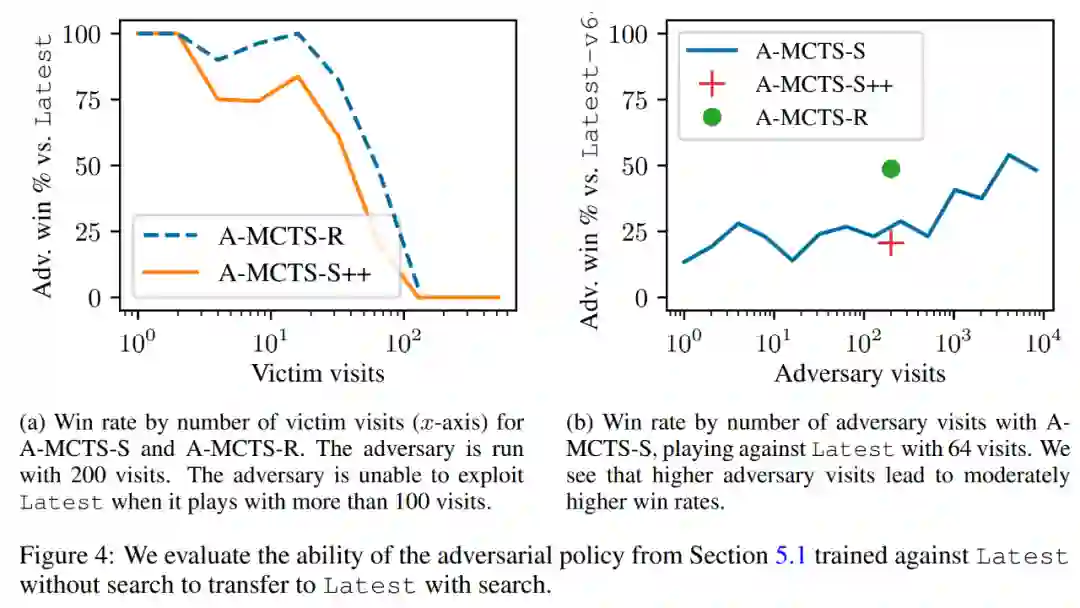 研究者将对抗策略成功地迁移到了低搜索机制上,并评估了上一节训练的对抗策略对有搜索 Latest 的能力。如下图 4a 所示,他们发现在 32 个受害者回合时,A-MCTS-S 对受害者的胜率下降到了 80%。但这里,受害者在训练与推理时都没有搜索。