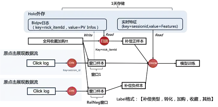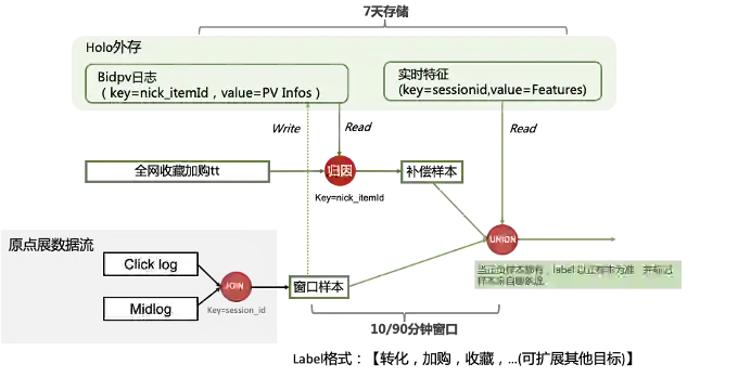 数据流程: 因为部分用户会“立即加购”或“立即购买”,部分正样本会很快回流。因此,为避免一些不必要的假负样本,我们建立一个数据流等待10分钟窗口,窗口时间到达时向样本流发送正负样本。10分钟外发生正样本再以补偿样本形式进入样本流。具体的如下图。首先,用 Holo 外存保存7天的样本存储作为归因逻辑的样本池。曝光发生10分钟后,未发生加购/转化行为的样本都作为负样本进入样本流。当实时的用户正样本进入到tt数据流之后,与7天存储的样本进行归因,再将归因后的补偿正样本注入样本流。