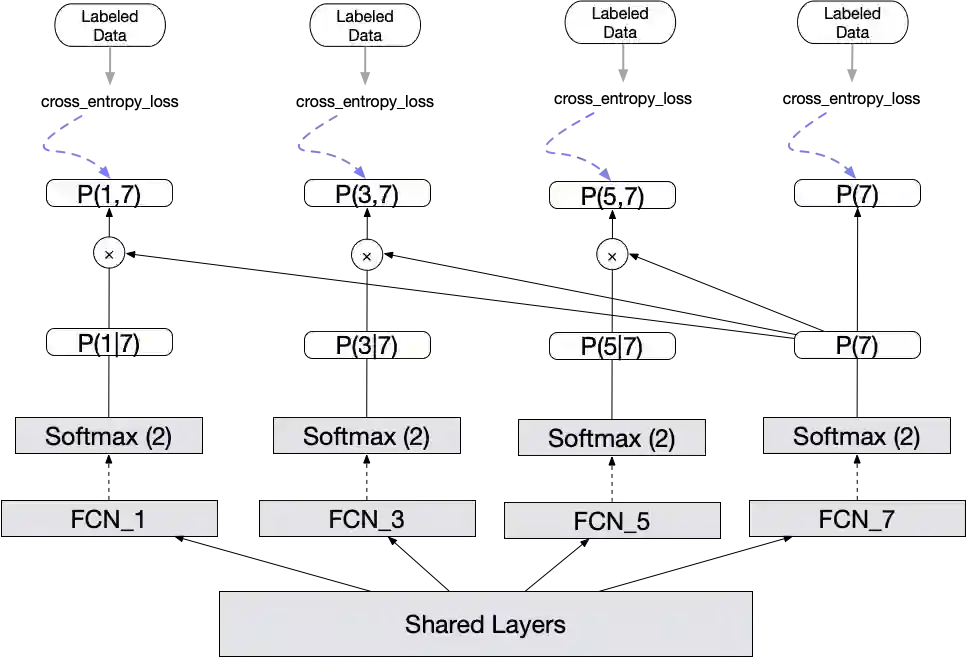 因此,我们的问题是,如何有效利用近6天样本,去优化7天归因转化的天级模型。我们提出一种天级样本延迟建模方式,通过一个端到端的多任务网络结构,同时建模转化模型和时延模型,隐式的通过时延模型影响实际转化模型的标签分布,达到准确学习7天转化模型的目的。