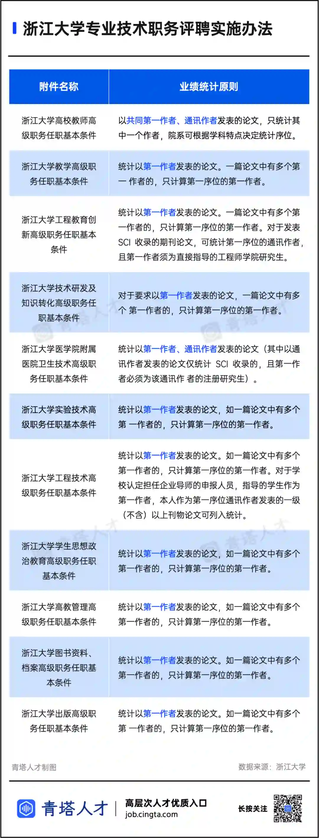 如:浙大在晋升职称统计论文发表情况时,需将共同作者的情况分别列出,部分高级职务任职基本条件也明确指出“只计算第一序列的第一作者。”
