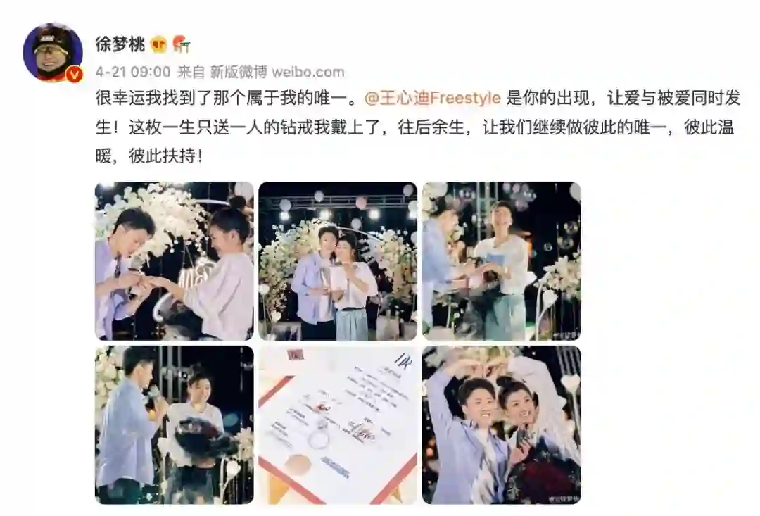 在结束冬奥会后,首夺奥运金牌的徐梦桃换了个赛场,作为参赛选手登上了综艺《乘风破浪第三季》,而徐梦桃在节目录制中被同为自由式滑雪空中技巧队的队友兼男友王心迪惊喜求婚,在节目播出后引起了热议。王心迪以一生仅能为一人定制的DR钻戒作为求婚承诺,不仅让徐梦桃感动落泪,也让不少观众直呼“太甜了!”。
