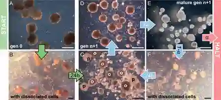 几天后,这些「下一代」就会变成外观、动作都与父辈一样的新 Xenobot。这些新的 Xenobot 会继续出去寻找细胞,建立自己的副本,循环往复。