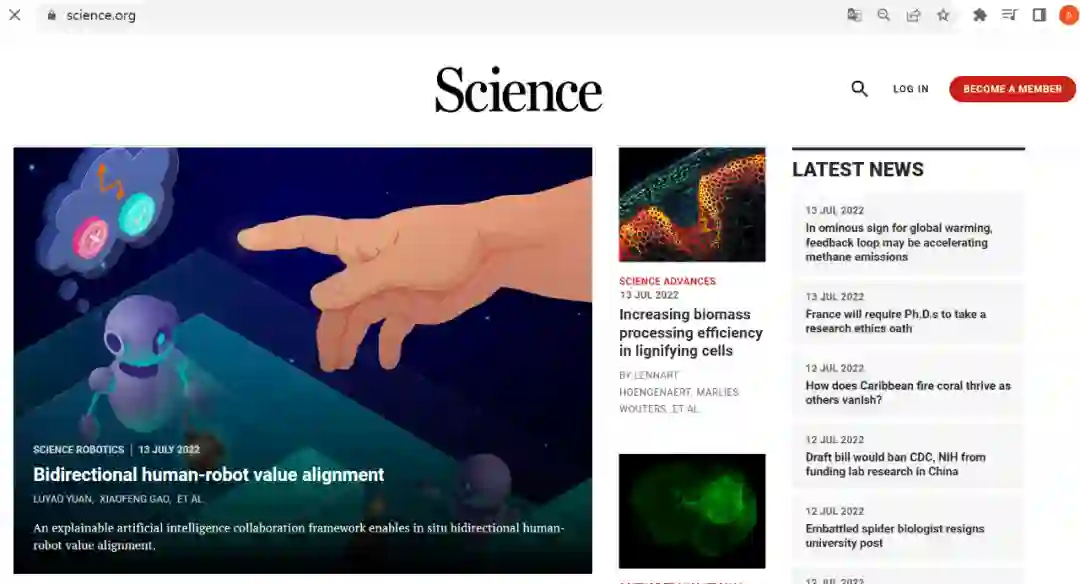 今日(7月14日),国际顶级学术期刊<Science Robotics >发表了朱松纯团队(UCLA袁路遥、高晓丰、北京通用人工智能研究院郑子隆、北京大学人工智能研究院朱毅鑫等作者)的最新研究成果——实时双向人机价值对齐 Bidirectional human-robot value alignment。