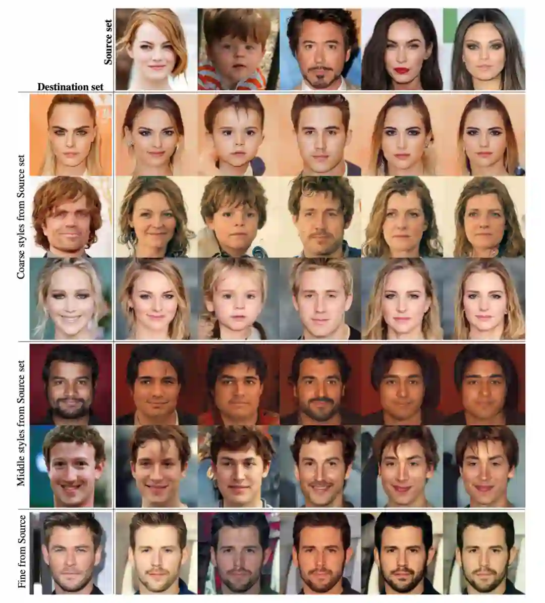 图 9:StyleALAE 的风格混合效果。「coarse styles」从 Source 图像中复制了高级特征,如姿势、大致发型和脸型,从 Destination 图像中复制了所有颜色(眸色、发色和光照);「middle styles」从 Source 图像中复制了较小型的面部特征例如发式、眼睛睁/闭,从 Destination 图像中复制了脸型;「fine styles」从 Source 图像中复制了颜色和微结构。