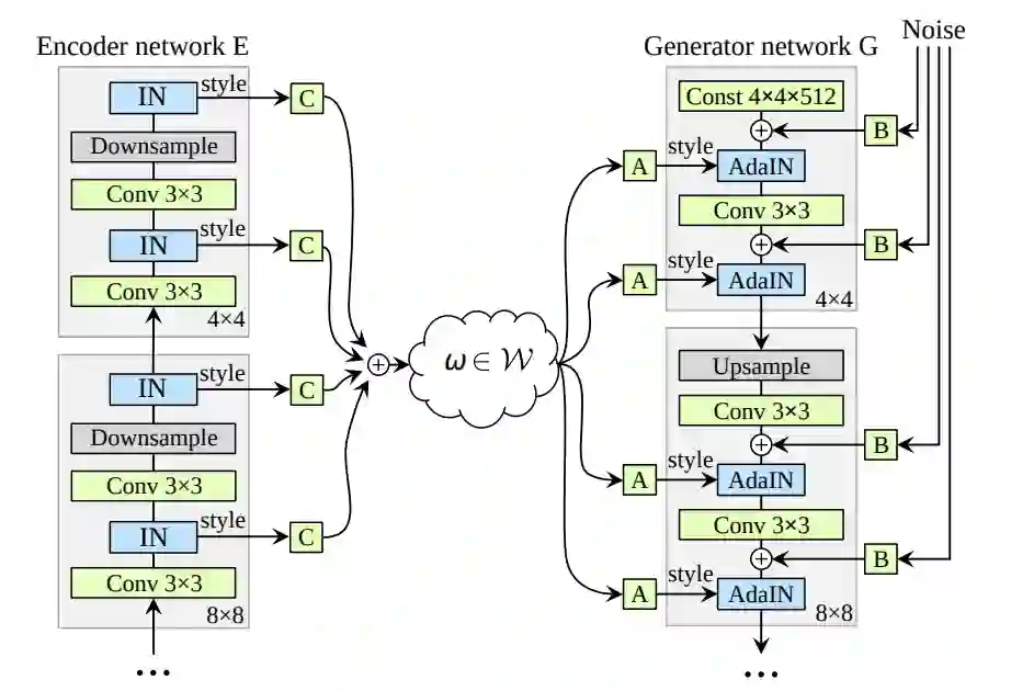 图 2:StyleALAE 架构。StyleALAE 编码器中的实例归一化(IN)层用来提取多尺度风格信息,并通过可学习的多重线性映射(multilinear map)将它们组合成为一个潜在代码 w。