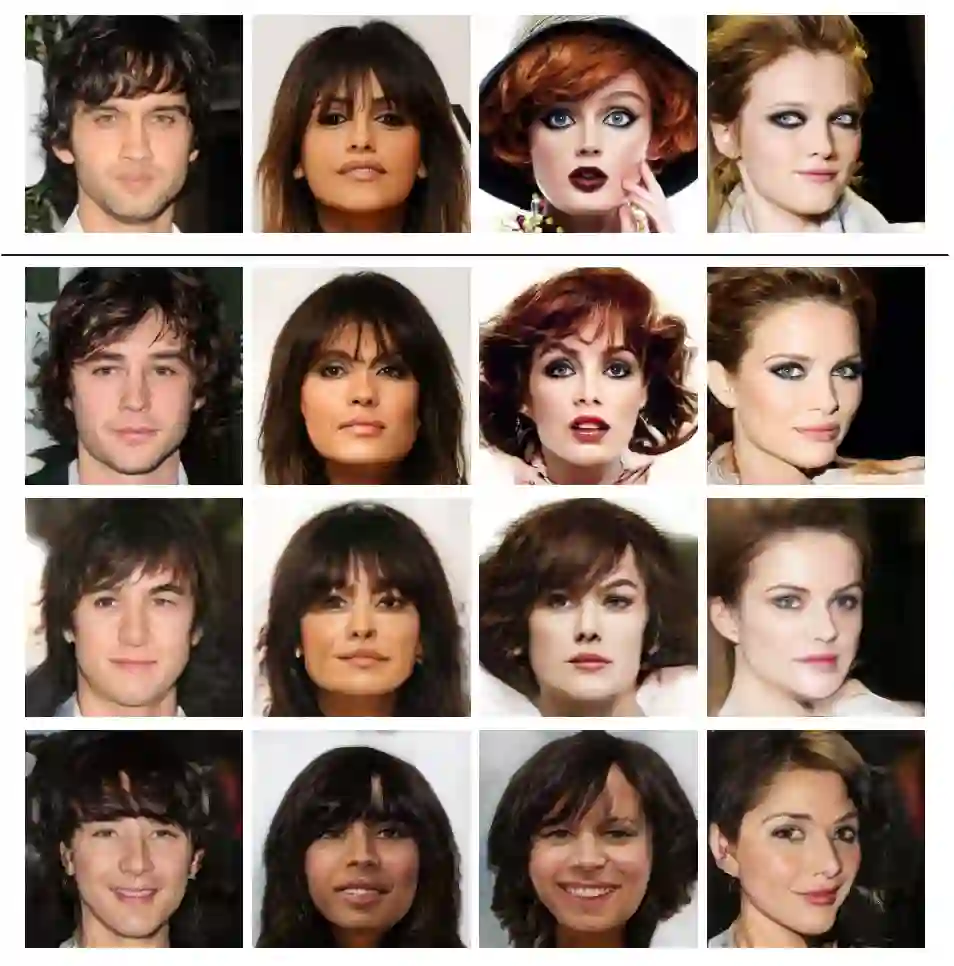 图 8:不同方法在 CelebA-HQ 数据集上的重建结果。第一行是真实图像;第二行:StyleALAE;第三行:Balanced PIONEER;第四行:PIONEER。