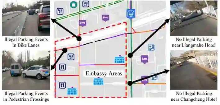违章停车问题是现在大城市普遍需要面对的难题。随着汽车保有量增加,停车位供不应求,违章停车变得十分严重。目前检测违停常用的方法是交警巡逻。这样的方法耗费大量人力,且效率不高。此外,随着城市中摄像头的采用,基于视频的违停检测技术也开始推行。然而,摄像头及检测系统的部署和维护非常昂贵,最终也导致用于检测违停的摄像头覆盖率不足。