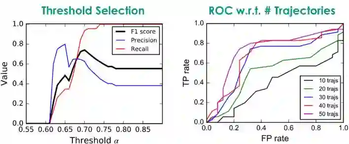 此外,作者还研究了在不同的数据量下,算法效果的变化。文章中,通过限制待测轨迹数从 10 到 50,画出了对应的 ROC 曲线,曲线下方面积越大效果越好。从结果中可以发现,算法效果随着数据量的上升而变好。另外,基于 30 条轨迹的检测效果和 50 条的效果非常接近。作者认为,只要轨迹数量至少达到一定量(如 30 条),就可以得到相对准确的检测结果。