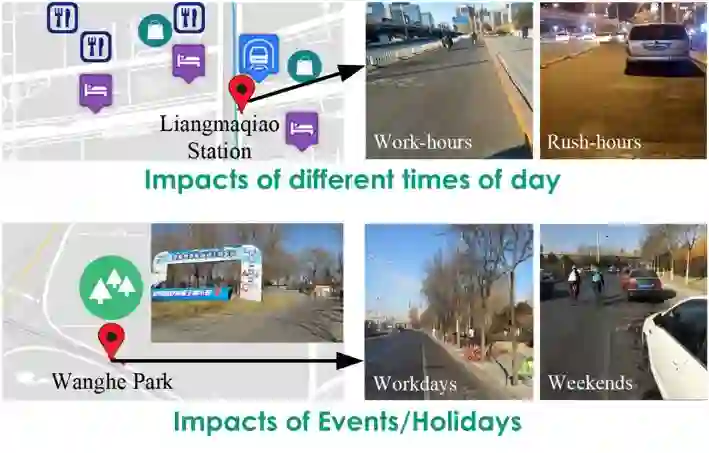 为了更好地评估违停检测算法的优劣,论文作者根据得到的实验结果(路段颜色越深表示违停情况越严重),在亮马桥地铁站附近做了实地考查。作者发现,被检测违停严重的红色框内是大使馆区,上班族较多,且有不少饭店,但区域内缺乏停车场建设,因此,车辆违停现象严重,甚至出现在自行车道、人行斑马线上;相比之下,东边的三环辅路,一路周围空旷,只有两个拥有大量停车位的酒店,极少出现违停。这些考察进一步验证了实验结果的有效性。