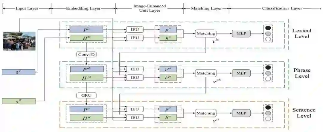 此外,语言所处的环境信息(如图像)会对语言的语义产生影响。进一步地,图像所包含的信息可能与句子语义的不同的粒度表示有关联。为此,如图2所示,图像增强的层次化句子语义表示网络IEMLRN[19]利用图像信息从不同粒度来增强句子的语义理解与表示,实现了更为准确的句子语义表示,以及句子对的语义关系分类。
