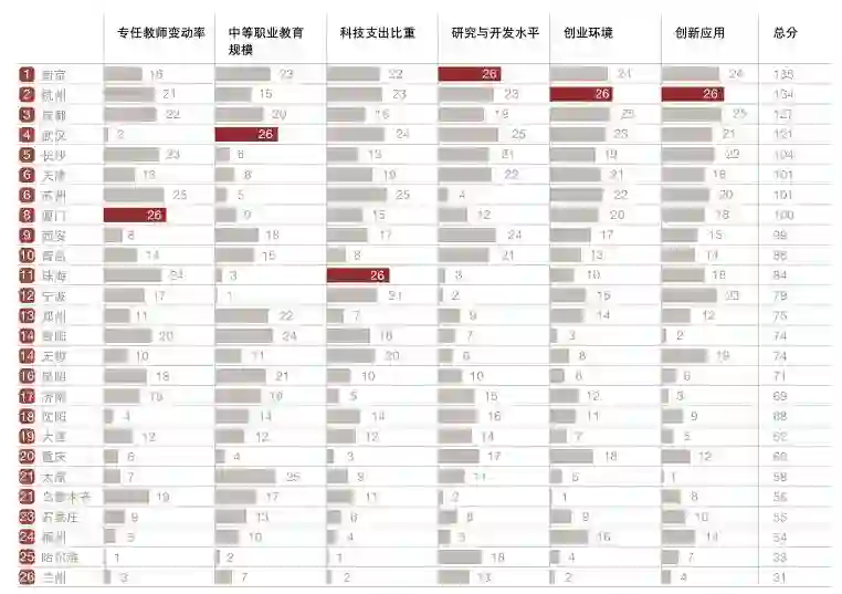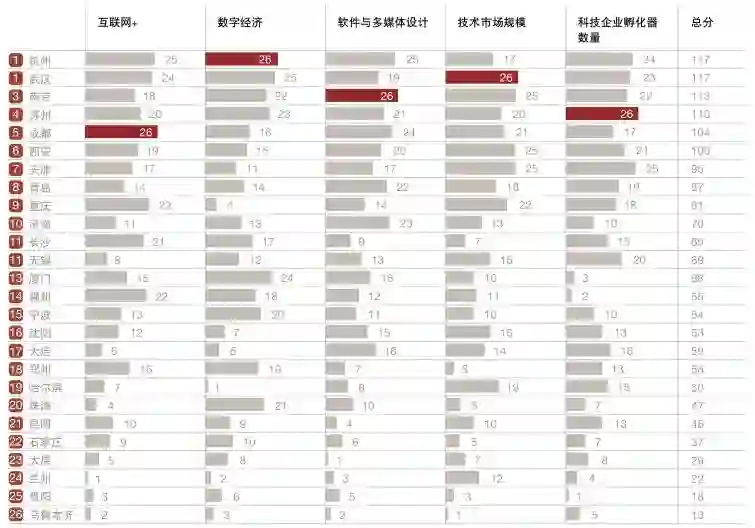 “其中,排在前列的是南京、武汉、西安、杭州、天津。最后两个变量反映的是“双创”,创新和创业,排在前三位的都是杭州、成都、南京。这两个维度与“研究与开发水平”一起在某种程度上反映了大学以上教育的成果,它们既反映科技创新的局面,也构成了智力资本的重要要素。