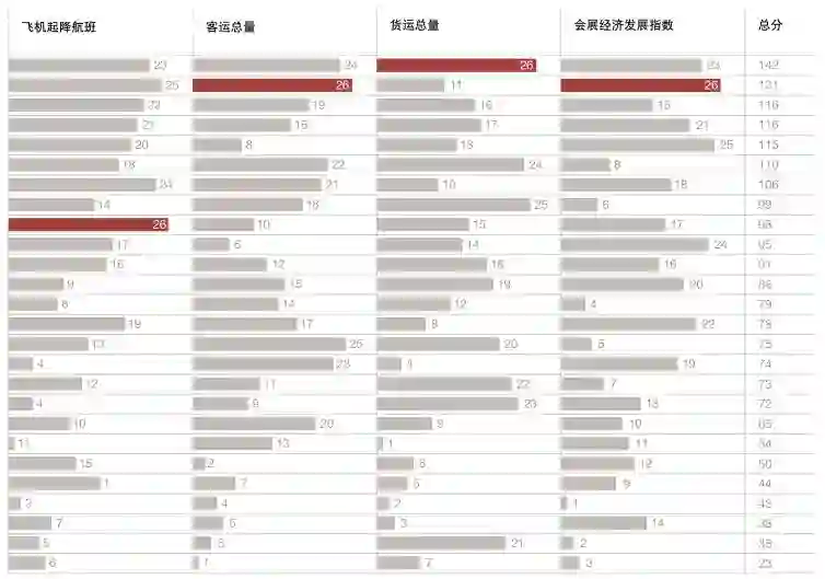“区域重要城市”这个维度反映了所观察的城市在区域内的地位,并反映该城市对区域整体发展的带动作用。本维度包括六个变量:“星级酒店”、“国际游客”、“飞机起降航班”、“客运总量”、“货运总量”和“会展经济发展指数”。