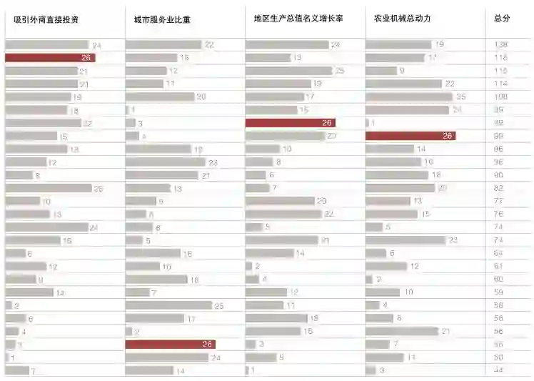 城市是经济成长的产物,同时经济成长也塑造了城市。城市的规模在一定程度上反映了城市对周边区域和中小城市的影响力,我们从“知名企业数量”、“金融从业人员”、“吸引外商投资”、“城市服务业比重”、“地区生产总值名义增长率”、“农业机械总动力”六个角度来观察。