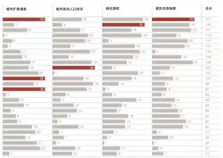 在26座城市的总排序中居后位的乌鲁木齐,在“住宅价格”变量上位居第一,不仅显示了实际生活成本的某一方面,而且使该城市的总积分有所提高。乌鲁木齐在总排序中超越了石家庄、哈尔滨、兰州,在这个变量上积分高是因素之一(乌鲁木齐在维度八的“城市服务业比重”变量上也有突出表现)。