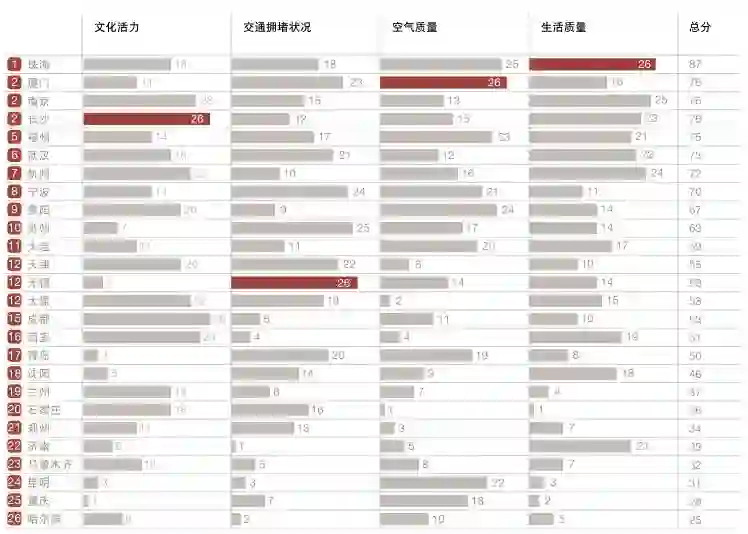 除北上广深四城以外,26 座城市的综合数据梳理结果:杭州位居第一,随后是武汉、南京、成都、厦门、西安、天津,至此排序与上年相同;接下来是长沙、苏州、郑州、珠海、青岛、济南、昆明、重庆、宁波,其中长沙上升了两位,青岛排在了济南的前面,但重庆却下降了三个位次。