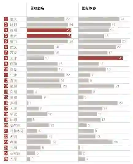 观察的对象既包含省会城市,也考虑了区域内经济发达的城市,同时也选择了与国际交往关系深厚的门户城市。统计表明,重庆、成都、杭州和南京(并列)、厦门排名位列前五。