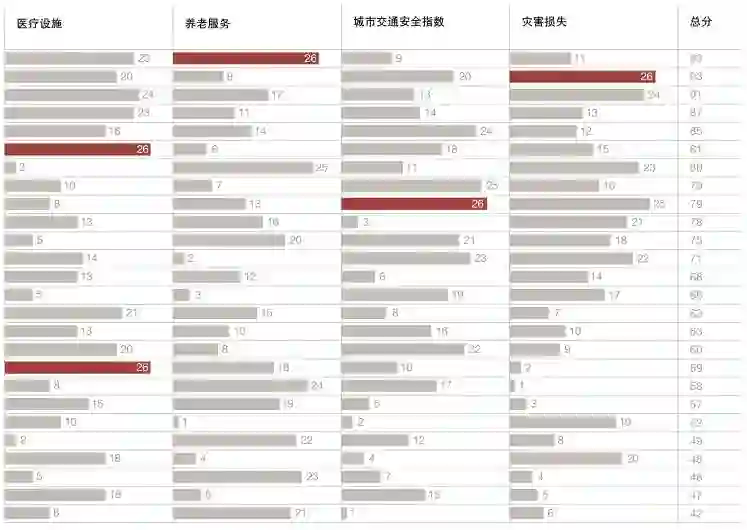 在本维度中设计了五个变量,分别是“医护资源”、“医疗设施”、“养老服务”、“城市交通安全指数”和“灾害损失”。本维度排名前五位的城市分别为杭州和成都(并列)、西安、太原和贵阳,随后是武汉、珠海、长沙和郑州(并列)以及济南。