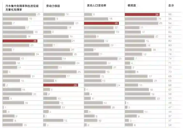 “可持续发展与自然环境”维度主要是从资源、环境和劳动力供给的角度观察对城市未来发展的影响。有五个变量:“居民人均水资源”、“污水集中处理率和生活垃圾无害化处理率”、“劳动力供给”、“流动人口变动率”、“碳排放”。