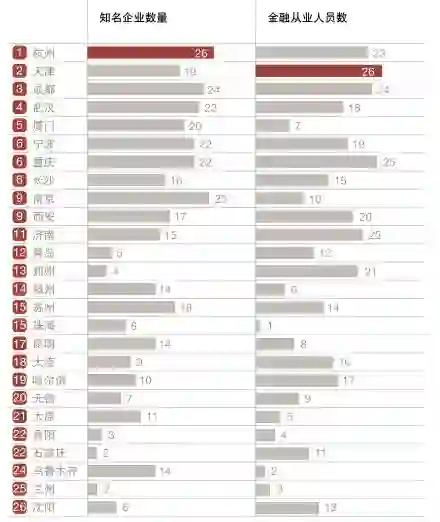 作为直辖市的天津,在26座城市的排名中仅列第七位,天津在这个维度能够凸现出来,一定程度上是因为“金融从业人员”采用的是按绝对数取值。
