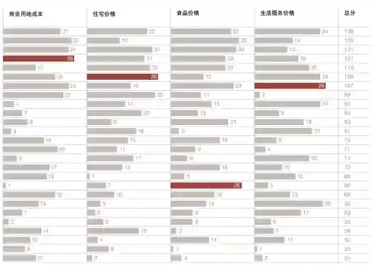 26座城市中,投资及生活成本最高的城市是杭州,特别是在公共交通和住宅价格变量上排位明显。珠海在维度排名中跟在杭州后面,成为26座城市中成本第二高的城市,缘于在“食品价格”和“生活服务价格”两个变量上位置突出。