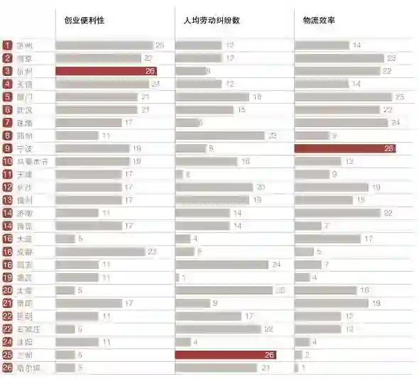 此外,位列总排名第五的厦门在“外贸依存度”和“物流效率”变量中分列第一和第二。