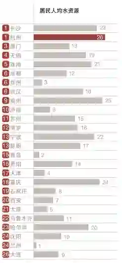 数据梳理结果,长沙与杭州并列第一。长沙在维度中居首得益于在“碳排放”变量上排第一,在“污水集中处理率和生活垃圾无害化处理率”变量上排第二,在“居民人均水资源”位列第四,使得累计积分最高。变量统计是枯燥的,并且有些抽象,但这一结果与现实生活却十分贴切。