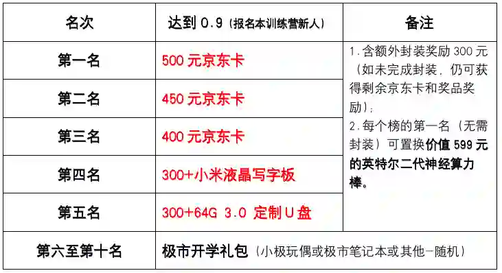 注:上述奖励的第一、二..名指在训练营期间,第一位、第二位达到0.9成绩的新人(不按分数排名)。【每个新人限领1次】