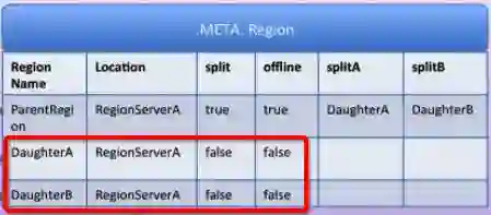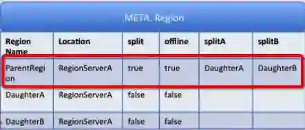 实际上HMaster会启动一个线程定期遍历检查所有处于splitting状态的父region,确定检查父region是否可以被清理。检测线程首先会在meta表中揪出所有split列为true的region,并加载出其分裂后生成的两个子region(meta表中splitA列和splitB列),只需要检查此两个子region是否还存在引用文件,如果都不存在引用文件就可以认为该父region对应的文件可以被删除。现在再来看看上文中父目录在meta表中的信息,就大概可以理解为什么会存储这些信息了: