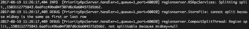 什么情况下会出现没有切分点的场景呢?最常见的就是一个文件只有一个block,执行split的时候就会发现无法切分。很多新同学在测试split的时候往往都是新建一张新表,然后往新表中插入几条数据并执行一下flush,再执行split,奇迹般地发现数据表并没有真正执行切分。原因就在这里,这个时候仔细的话你翻看debug日志是可以看到这样的日志滴: