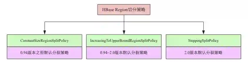 在最新稳定版(1.2.6)中,HBase已经有多达6种切分触发策略。当然,每种触发策略都有各自的适用场景,用户可以根据业务在表级别选择不同的切分触发策略。常见的切分策略如下图: