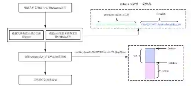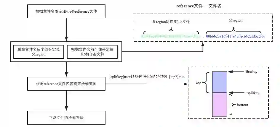 除此之外,还需要关注reference文件的文件内容,reference文件是一个引用文件(并非linux链接文件),文件内容很显然不是用户数据。文件内容其实非常简单,主要有两部分构成:其一是切分点splitkey,其二是一个boolean类型的变量(true或者false),true表示该reference文件引用的是父文件的上半部分(top),而false表示引用的是下半部分 (bottom)。为什么存储的是这两部分内容?且听下文分解。