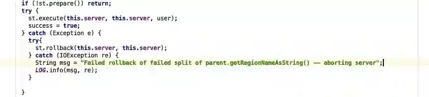 为了实现事务性,HBase设计了使用状态机(见SplitTransaction类)的方式保存切分过程中的每个子步骤状态,这样一旦出现异常,系统可以根据当前所处的状态决定是否回滚,以及如何回滚。遗憾的是,目前实现中这些中间状态都只存储在内存中,因此一旦在切分过程中出现regionserver宕机的情况,有可能会出现切分处于中间状态的情况,也就是RIT状态。这种情况下需要使用hbck工具进行具体查看并分析解决方案。在2.0版本之后,HBase实现了新的分布式事务框架Procedure V2(HBASE-12439),新框架将会使用HLog存储这种单机事务(DDL操作、Split操作、Move操作等)的中间状态,因此可以保证即使在事务执行过程中参与者发生了宕机,依然可以使用HLog作为协调者对事务进行回滚操作或者重试提交,大大减少甚至杜绝RIT现象。这也是是2.0在可用性方面最值得期待的一个亮点!