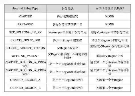 rollback阶段:如果execute阶段出现异常,则执行rollback操作。为了实现回滚,整个切分过程被分为很多子阶段,回滚程序会根据当前进展到哪个子阶段清理对应的垃圾数据。代码中使用 JournalEntryType 来表征各个子阶段,具体见下图: