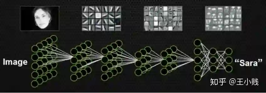 而通过一些对神经网络隐层的可视化我们也发现:比如下图的一个人脸识别的例子,神经网络在这个过程中先学到了边角的概念,之后学到了五官,最后学到了整个面部的特征。