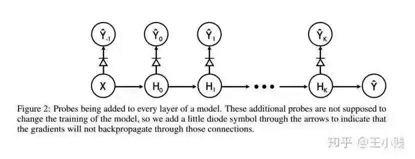 对于神经网络来说,隐层的数量永远都是一个玄学,我们如何理解隐层的数量和模型性能之间的关系呢?Bengio在2016年还做过一个工作《Understanding intermediate layers using linear classifier probes》 。这篇文章的思路非常简单,就是通过在每个隐层中添加一个线性探针来测试隐层的表征性能。什么是线性探针呢?也很简单,就是以每个隐藏层为输入,判别的label为输出建立一个逻辑回归模型,通过评估模型的准确率我们就能得到隐层在整个训练过程中以及训练结束之后表征性能的变化。