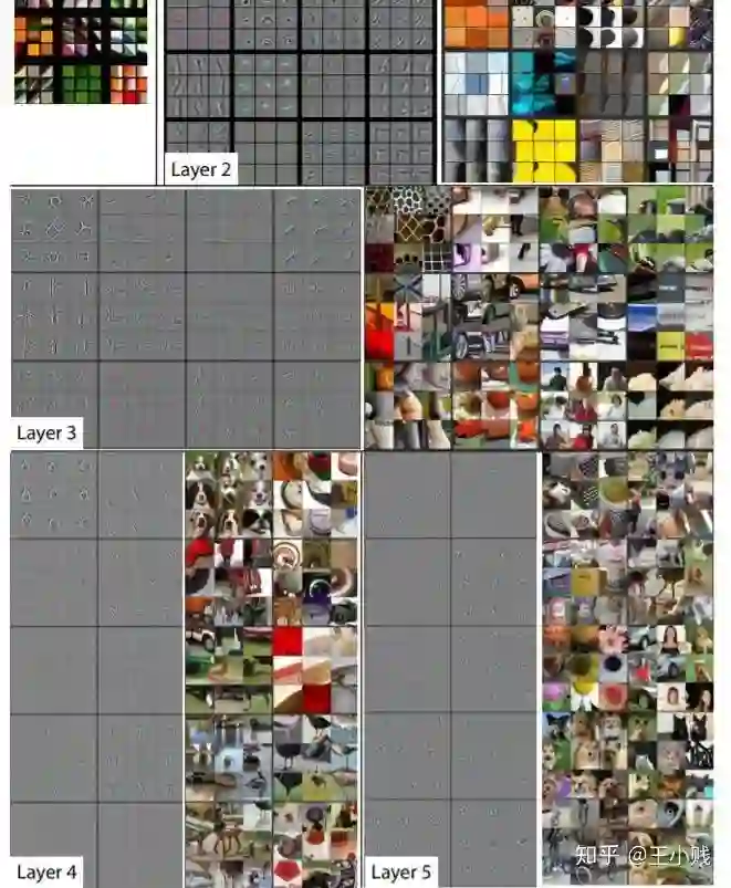 从实验结果可以看出来,第二层对应着一些边角或色彩特征,第三层对应着纹理特征,第四层对应着一些如狗脸、车轮这样的局部部位,第五层则对整体的物体有较强的识别能力。