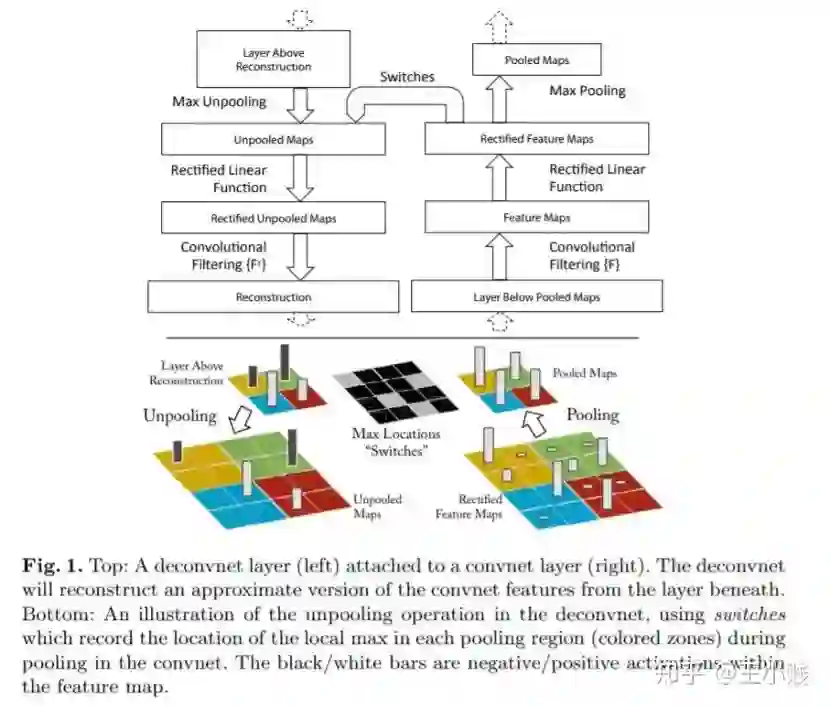 要理解神经网络中每层都学到了哪些概念一个非常直观的方法就是通过对隐层运用一些可视化方法来将其转化成人类可以理解的有实际含义的图像,这方面一个非常具有代表性的一个工作就是14年ECCV的一篇经典之作:《Visualizing and Understanding Convolutional Networks》 ,这篇文章主要利用了反卷积的相关思想实现了特征可视化来帮助我们理解CNN的每一层究竟学到了什么东西。我们都知道典型的CNN模型的一个完整卷积过程是由卷积-激活-池化(pooling)三个步骤组成的。而如果想把一个CNN的中间层转化成原始输入空间呢?我们就需要经过反池化-反激活-反卷积这样的一个逆过程。整个模型的结构如下图所示: