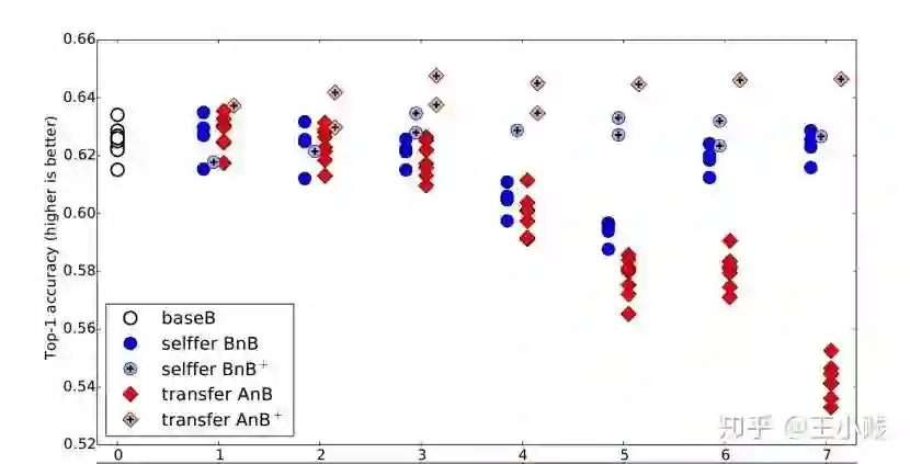 而从实验结果来看,transferAnB的随着层数的增加性能在不断下降(泛化降低,特化提升,这印证了我们对泛化特化性质随层数变化的基本判断),而控制组的selfferBnB的性能出现了先下降后上升的现象(泛化和特化都不足够的中间层既缺乏可学习性,特征的描述性又不够强,因而出现了性能下降的现象),transferBnB+和transferAnB+一直维持着比较好的性能,但其中transferAnB+的性能确是最好的,特征在迁移任务上表现出来的优势其实也对应了我们在上一节中讲的模型本身也意味着知识 。